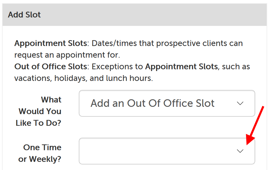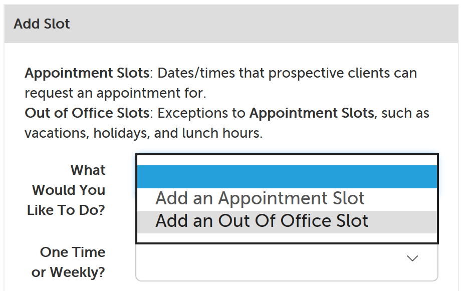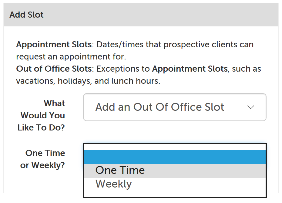 This support article will go over the process for adding out of office slots to your calendar, which are exceptions to any appointment slots you have already added (or may add) in the future. (If you use the Google Calendar or Microsoft Outlook calendar integrations, our system will already reference your other calendar for times that you have something else scheduled, so that it is not shown to potential participants. You will not need to add an out of office slot if that time is already blocked off in your connected Google or Outlook calendar.)