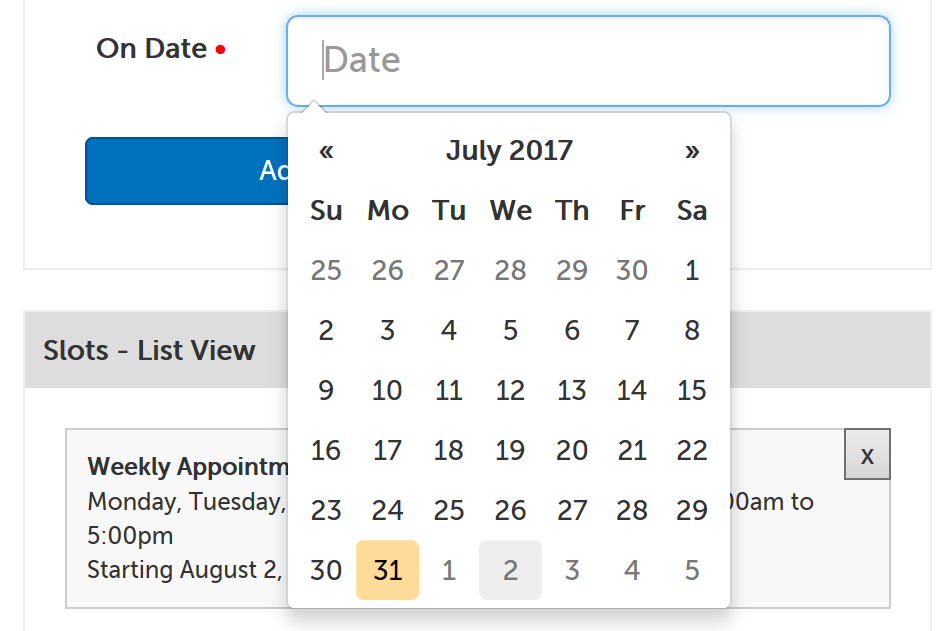 7. Click on the "Starting On" field to make the datepicker appear, and select the date the out of office slot should start on. (Leave blank to start immediately.)