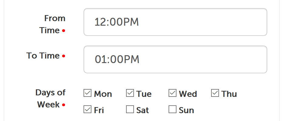 4. Click on the "From Time" field to have the timepick appear. Click a starting hour and then select minute value, in your account's time zone. Click "AM" or "PM" to indicate which is applicable.
