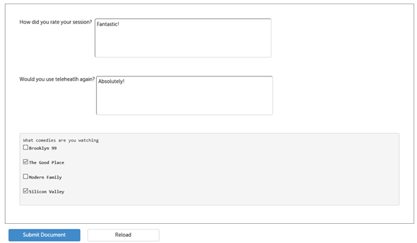 The MetaData returned in the example Document JSON above would have been generated using two steps. First, the MetaData property names "Session Rating", "Use Telehealth Again", and "What comedies are you watching" are defined when editing the Document Template: