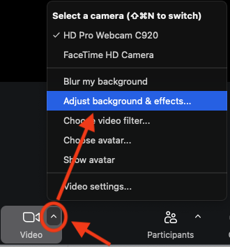 1. While in a Zoom meeting, click the upward arrow on the Video icon and select "Adjust background & effects..."