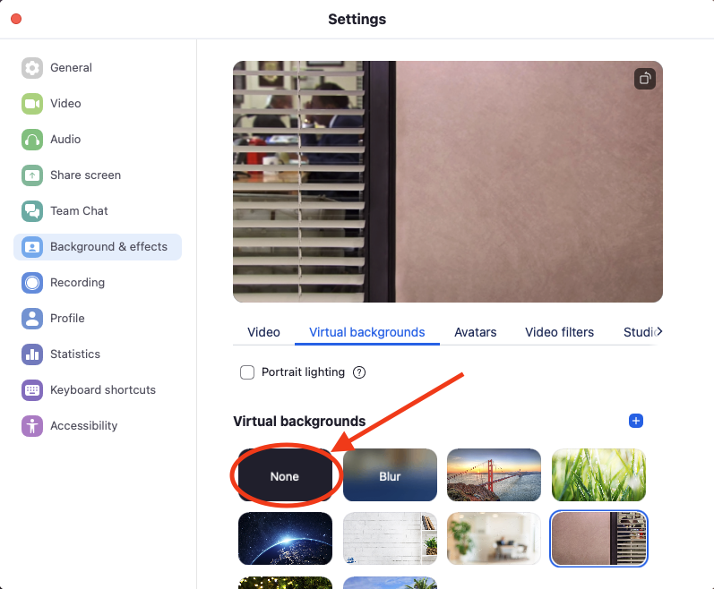 2. This will bring you straight to the "Background & effects" section of the Settings. Here you will be able to select "None" to remove any applied virtual background or blurring.